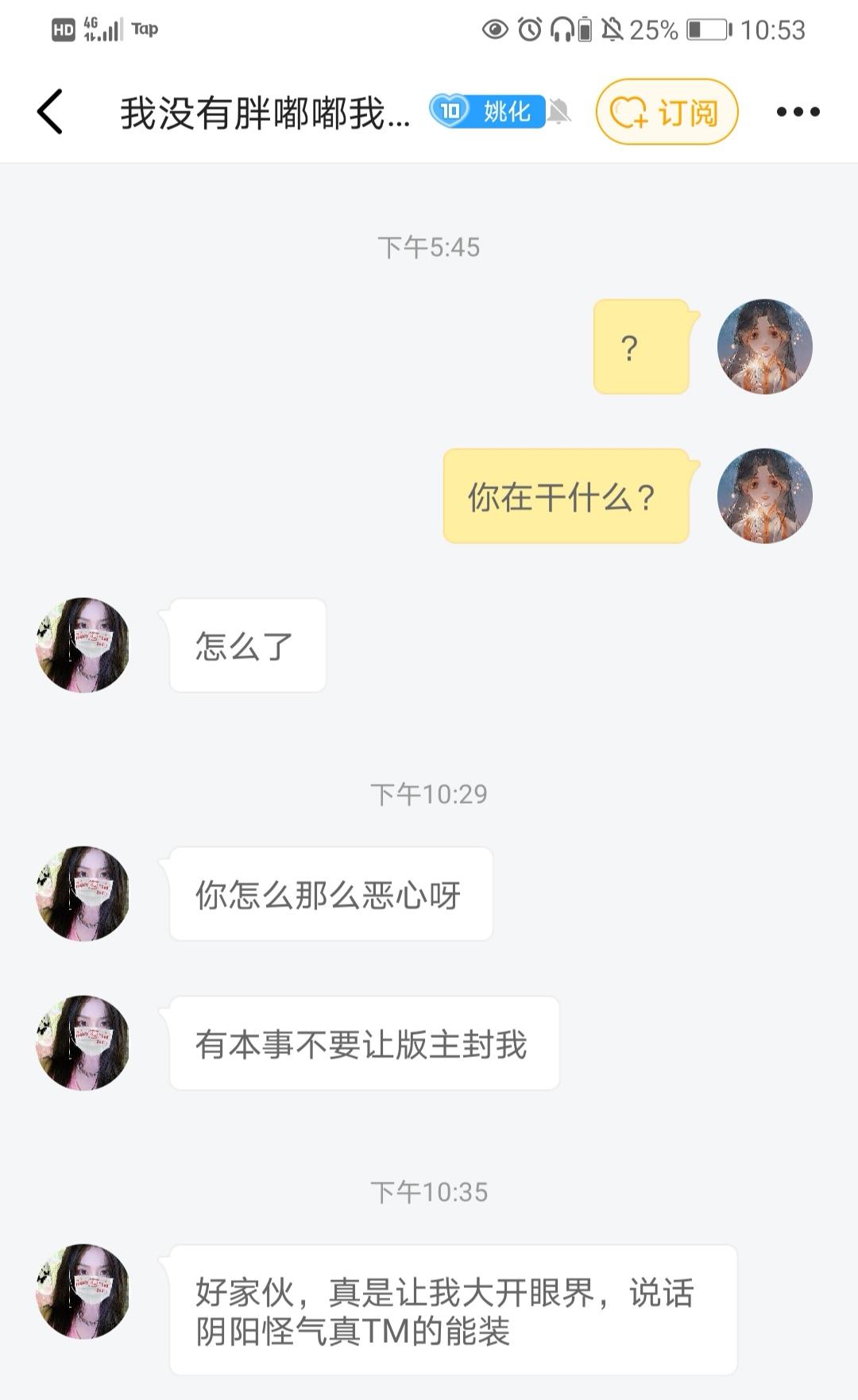 相信大家也知道了直播间禁言的瓜,然后某人就和她的xx,一起来虎牙私信我了,她的xx也继续在tap中叫。在贴子中我让她给我解释原因的过程中,我没有一句话是脏话,也并没有喷她,因为并不想跟这种人继续吵下去,所以我选择了拉黑屏蔽。结果反倒是她和她的xx急了,以下是虎牙私信我的图禁言风波(续)