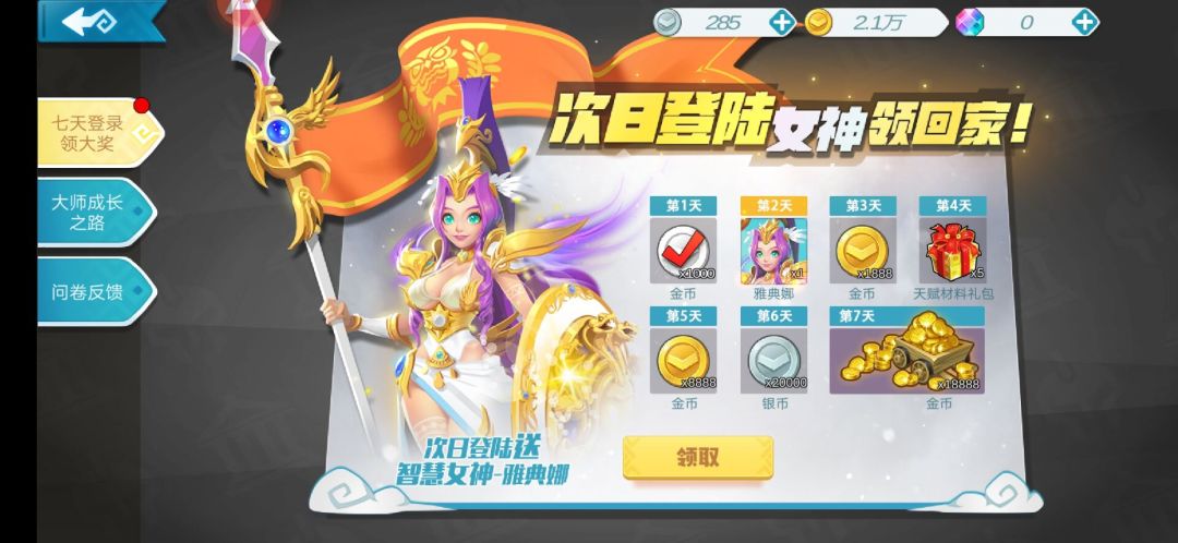 测试期间登录满对应天数,即可免费领取女神雅典娜,金币,银币,天赋礼包等豪华奖励。