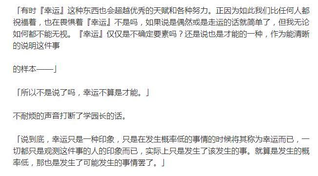 突然觉得神座姐姐可能并没有幸运的才能。记得在番外《苗木城——悲惨的一天》中有这么一段是校董会反对进行“超高校级的幸运”的选举,是说在他们眼中“幸运”并不算一种才能。而看过绝望篇后会发现校方在进行幸运抽取(番外有说最后抽取)之前神座计划就已经开始,那么,集所有才能于一身的人工希望所拥有的才能里是否有“幸运”存在,这点就存在疑问。