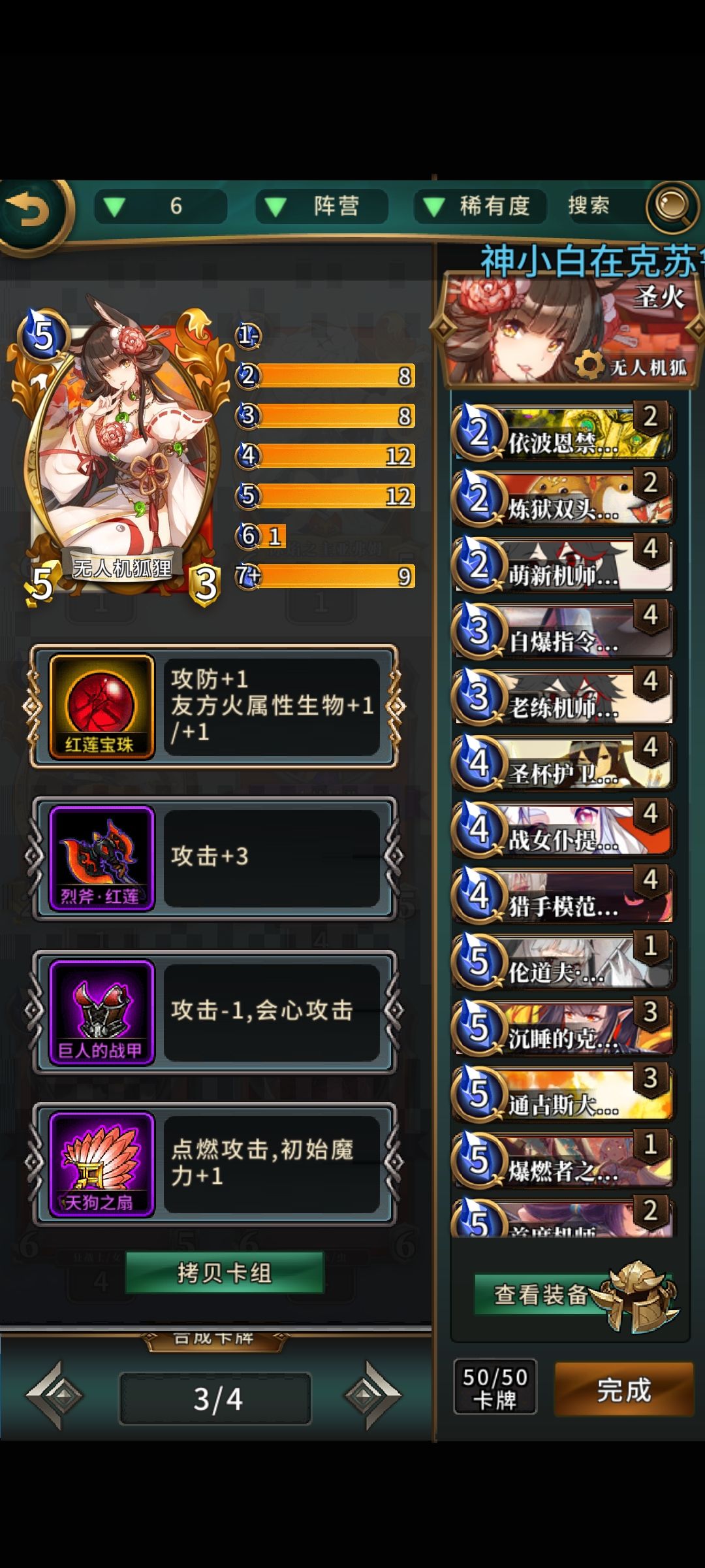 狐狸的装备装备没啥好说的红莲宝珠给场上的生物加身材,猎斧.红莲加攻击,巨人的战甲增加会心属性可以当墙用,用来保护一些重要的卡牌。最后推荐一张版本比较bt的卡牌,有的话可以选择带上,它就是依波恩禁断书。
