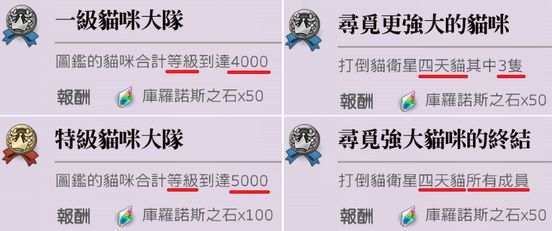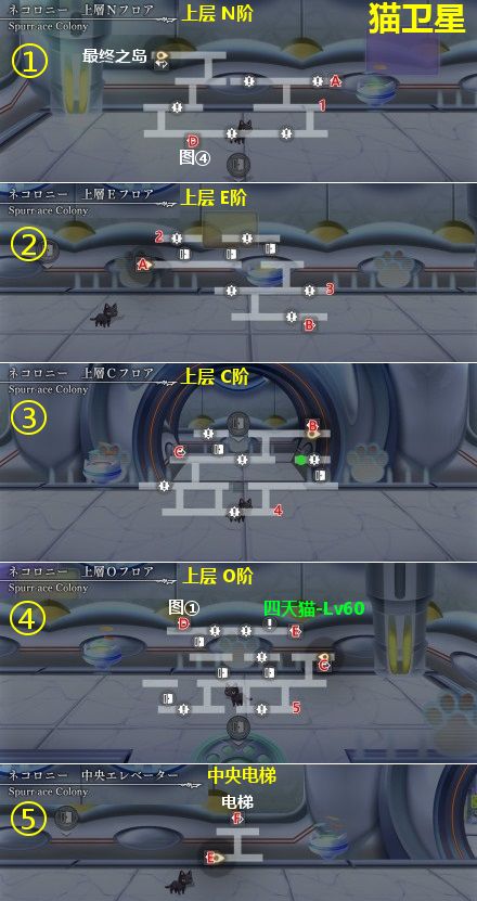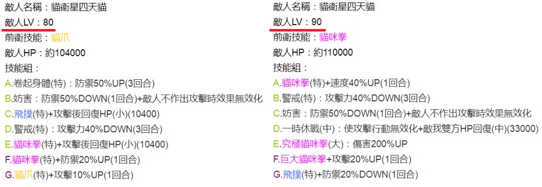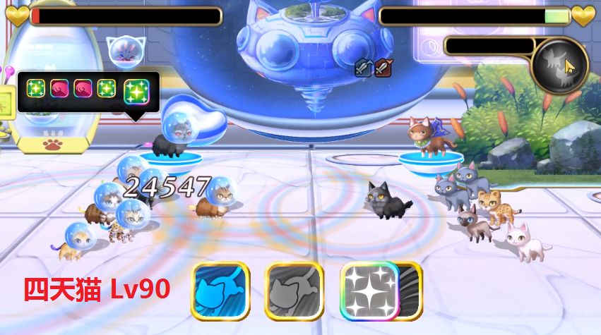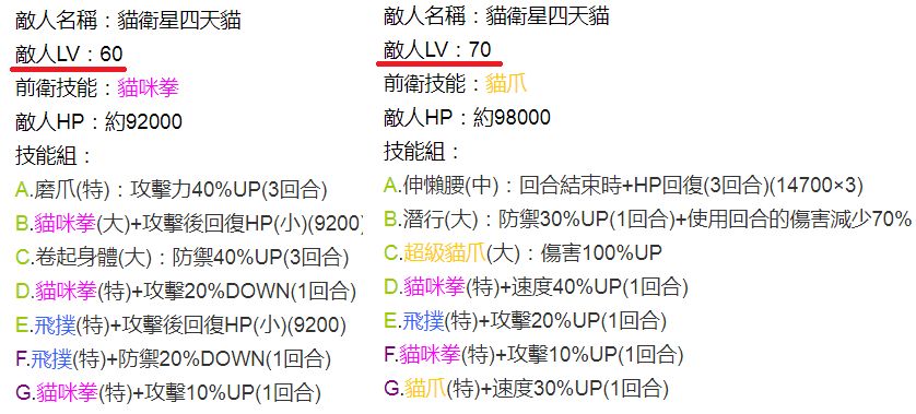 ⑤打败猫卫星四大天王——四天猫,等级分别为Lv60红,Lv70黄,Lv80蓝,Lv90红,每只50石(下图)