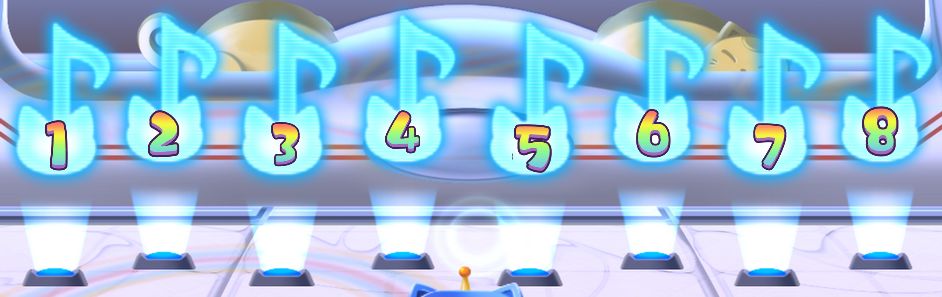 ①解锁:需要在Lv90猫那里(图⑦)的猫钢琴(下图)依次按4个音符才能开门,音符提示在各天猫所在地门口,有4行,每行有一只亮着的猫,代表按第几个音符。以下数字均表示按左数第几个音符:
