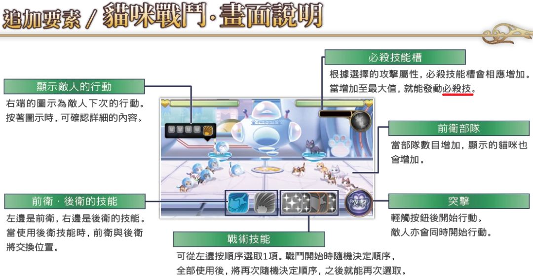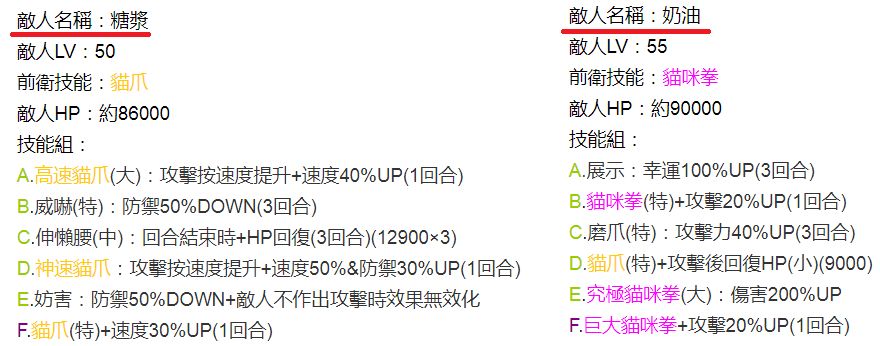 ③通关后,可以在BOSS处再次和糖浆(Lv50黄)战斗,胜利后学会以“神速猫爪”为主的新战术。再次和奶油(Lv55红)战斗,胜利后学会以"究极猫猫拳"为主的新战术。