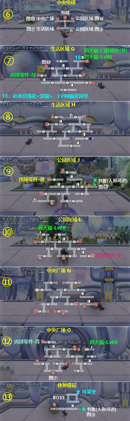 宝箱:1~18,其中8、12、13、17分别为绿、黄、紫、青肉球零件,18是必杀技强化<喜欢猫咪>,其他四天猫房间宝箱有猫装备稀有素材