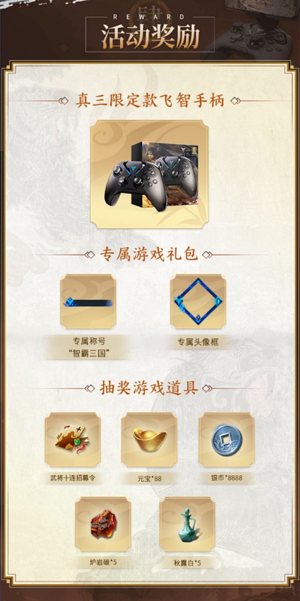 本次活动的特等奖为:真三限定款飞智手柄!这款“智霸三国”合作游戏手柄响应资深无双系列玩家手柄畅快搓招的“传统美德”,打破了手游搓玻璃的束缚。选中意武将无CD畅快搓招,让你体验深度完美复刻的无双技能。