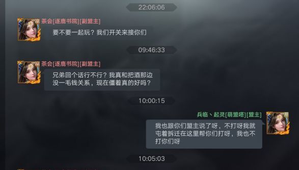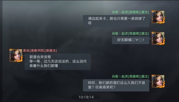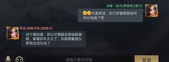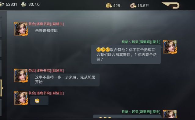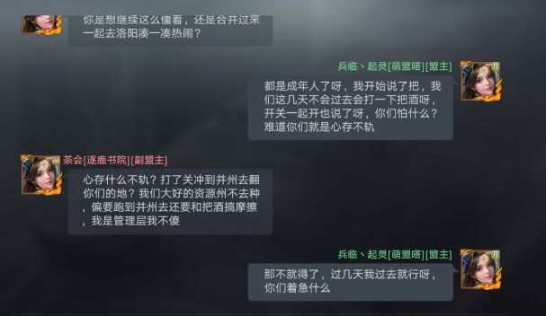 在形势一片大好的情况下,逐鹿书院却突然返回出生州,攻击凉并出生州关口鸡鹿塞,结果反而被并州萌盟嗒抢关成功。通过聊天内容我们可以知道,逐鹿书院看到萌盟嗒在和把酒祝东风的战争中失败,于是想吞并萌盟嗒,来壮大自己的实力。但逐鹿书院的管理层没有考虑到萌盟嗒和把酒祝东风的仇恨,也没有考虑到萌盟嗒作为有数次测试经验的盟,不是三言两语就能说服吞并的,表现的过于急切。