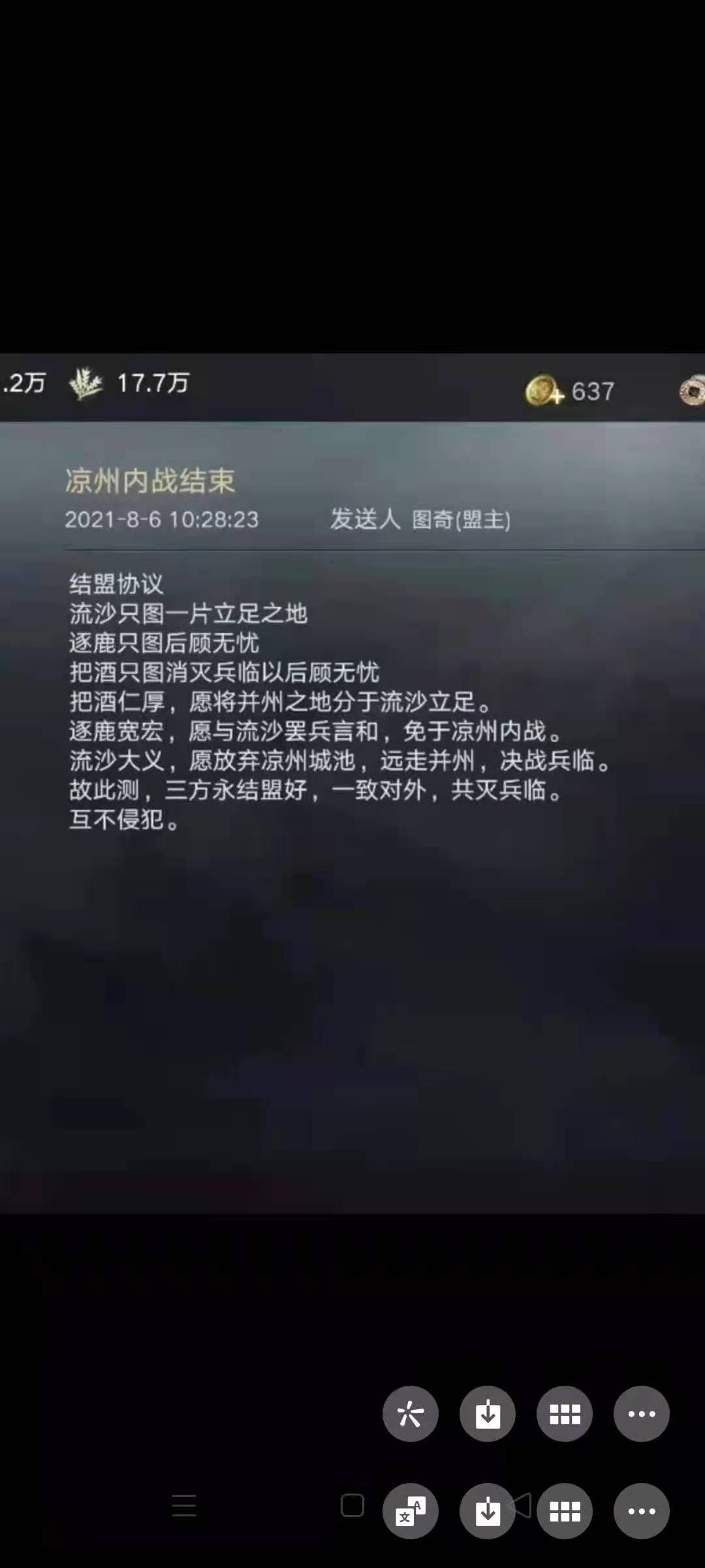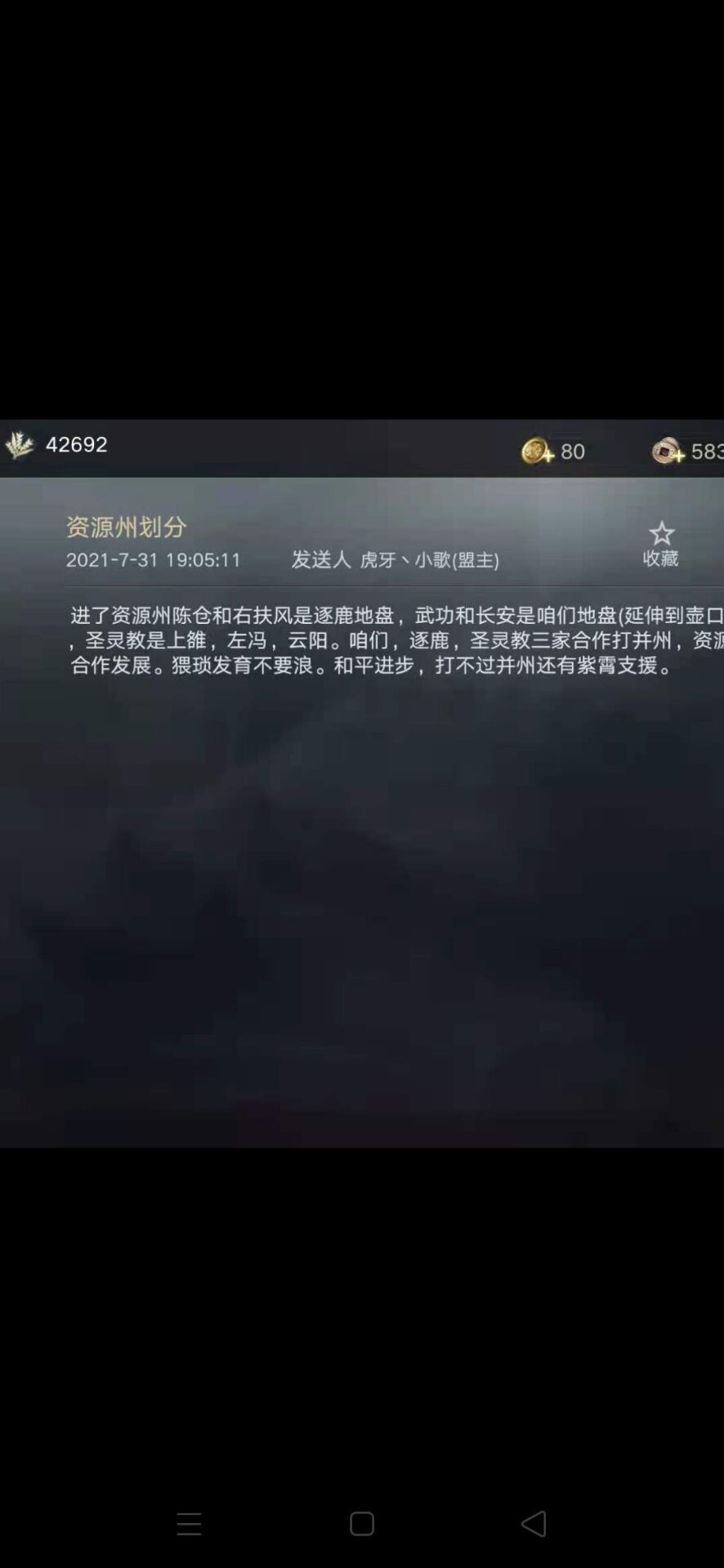 为何逐鹿书院起初势头强劲,但现在已然不行,这就不得不提到逐鹿书院的外交了。在开区前,逐鹿书院的多名管理同时与紫霄,圣灵,斗战,把酒,萌盟嗒定下了联盟或者互助协议,在开局初确保了出生州不会被攻击。随后因土地纠纷与流沙开战后,逐鹿迅速在与流沙的战争中取得优势,迫使流沙盟主苏寒不得不和流沙剩余成员集中迁城抱团一起来抵御逐鹿的进攻。在取得州内优势,压缩了流沙的活动空间后,逐鹿不久破关进入了资源州。通过斗战丶之巅盟主所发邮件,我们可以清晰的看出,逐鹿,圣灵,斗战为同盟关系,对资源州京兆进行了和平划分并共同对付并州的把酒祝东风联盟。直到此时,逐鹿的外交依然没有任何问题,以凉州益州两州之力对付并州,把酒祝东风在两个州三个盟的攻击下,落败只是时间的问题,而且并州后方的萌盟嗒也有不弱的实力,随时准备攻打把酒。冀州和青徐则分别被荆州和扬州盯住,不会支援把酒祝东风。