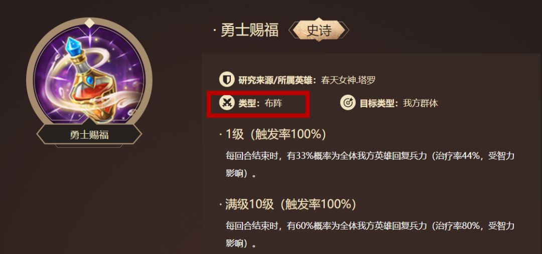 布阵:正式战斗之前的布阵阶段,为己方或敌方英雄提供增益/减益效果。布阵阶段就已经完成了!这是它和BUFF类主被动技能最大的区别。