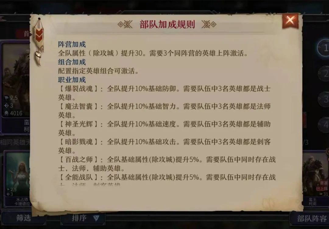 全队三个英雄都隶属于同一阵营时,就会激活阵营加成——全队属性(除攻城)提升30点。