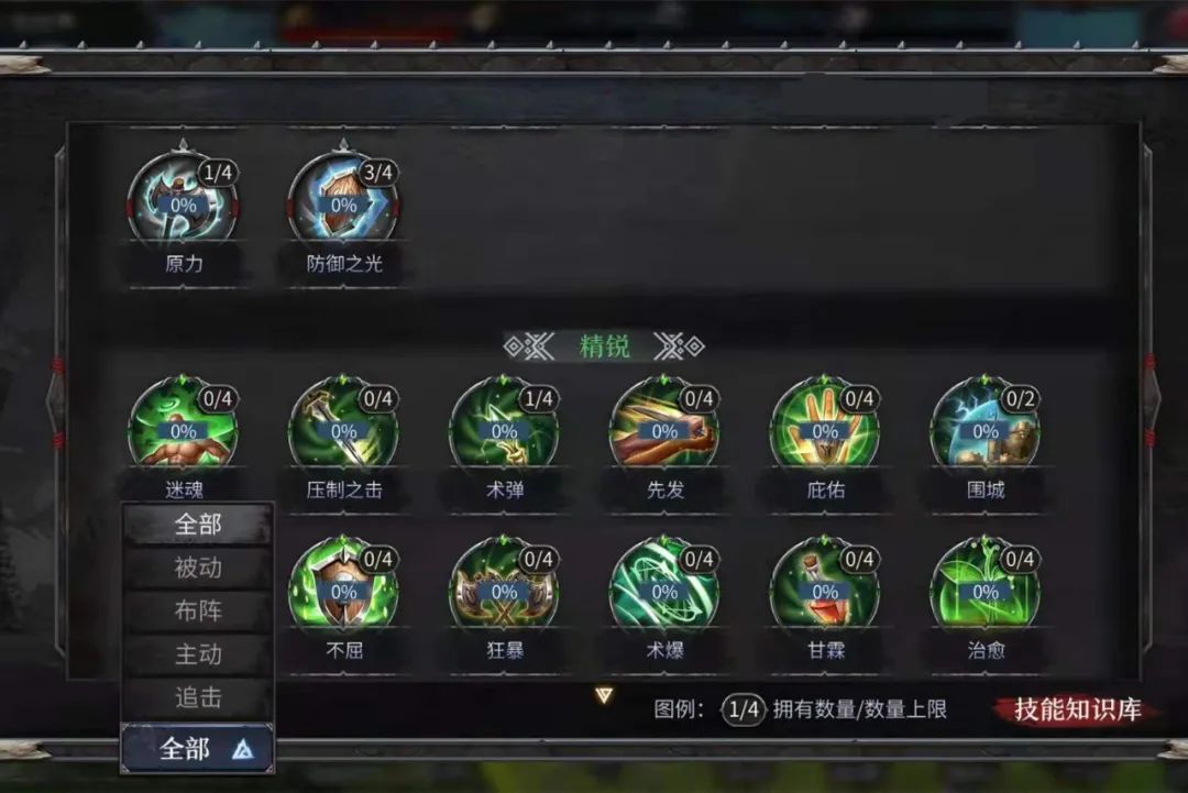 技能分为主动、被动、布阵、追击四大类。