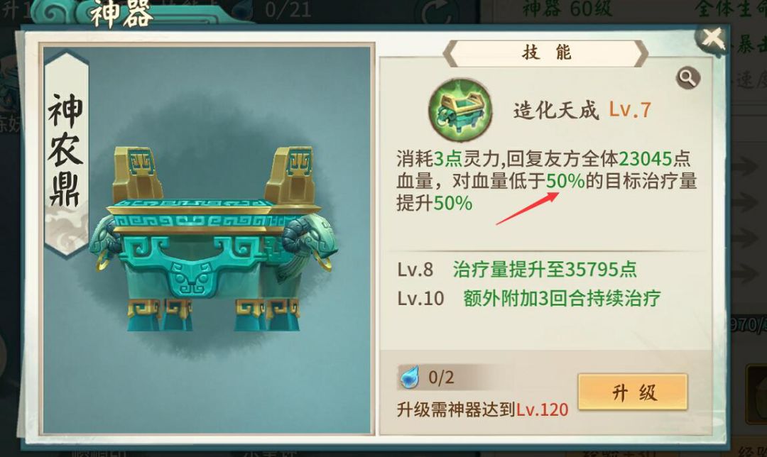 神器的等级建议全部升级到五级以上,这样可以让神器产生额外的效果。如图: