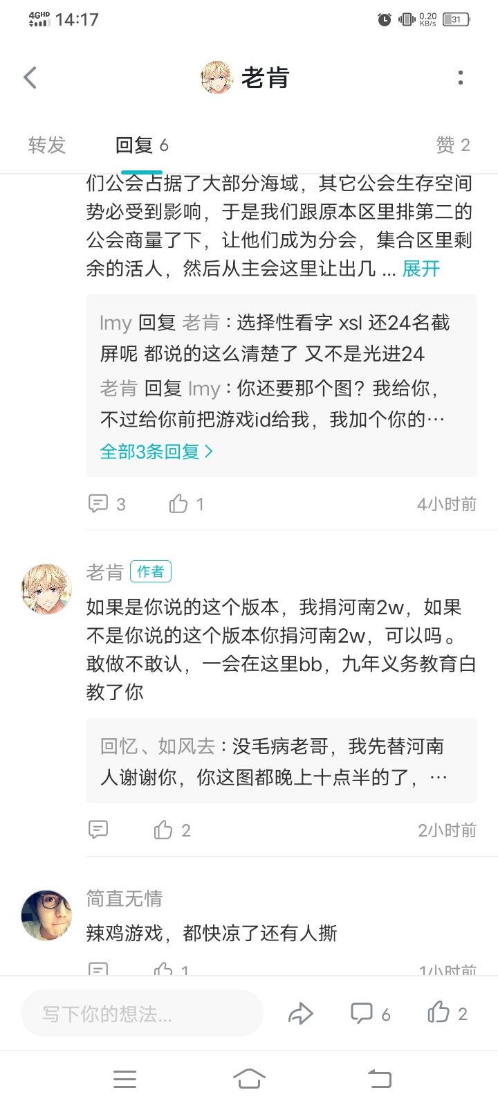关于某人因为不符合公会门槛被踢来论坛撕我并承诺如果他说的不符合事实就给河南捐款两万这件事,本来我不打算理他了,但是我是河南人,这两万我觉得可以争取一下,虽然键盘侠基本只会放屁,起因等会楼下我贴链接,懒得说了,证据放上来就行