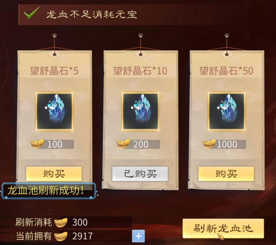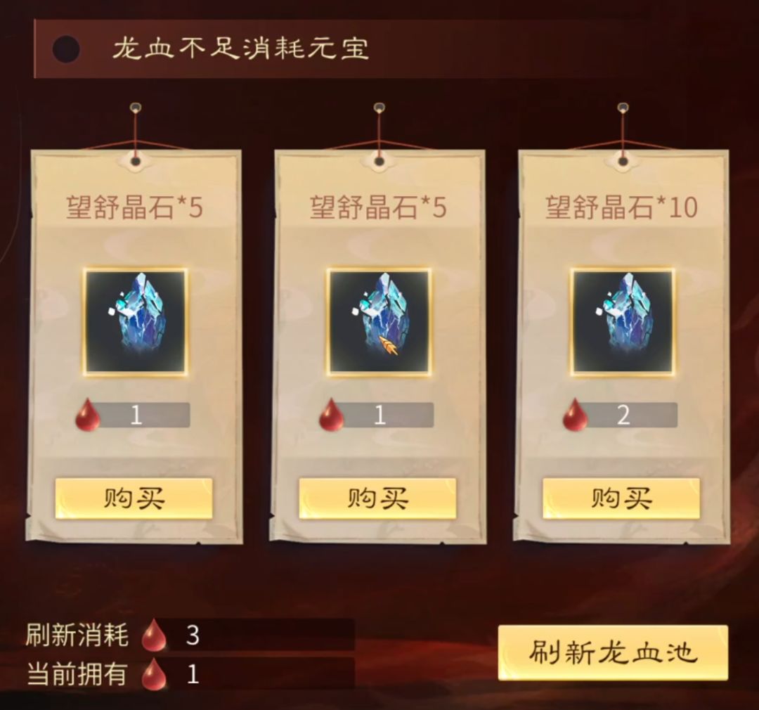 刷新一次为3滴龙血或300元宝。有几率刷到大量望舒晶石。
