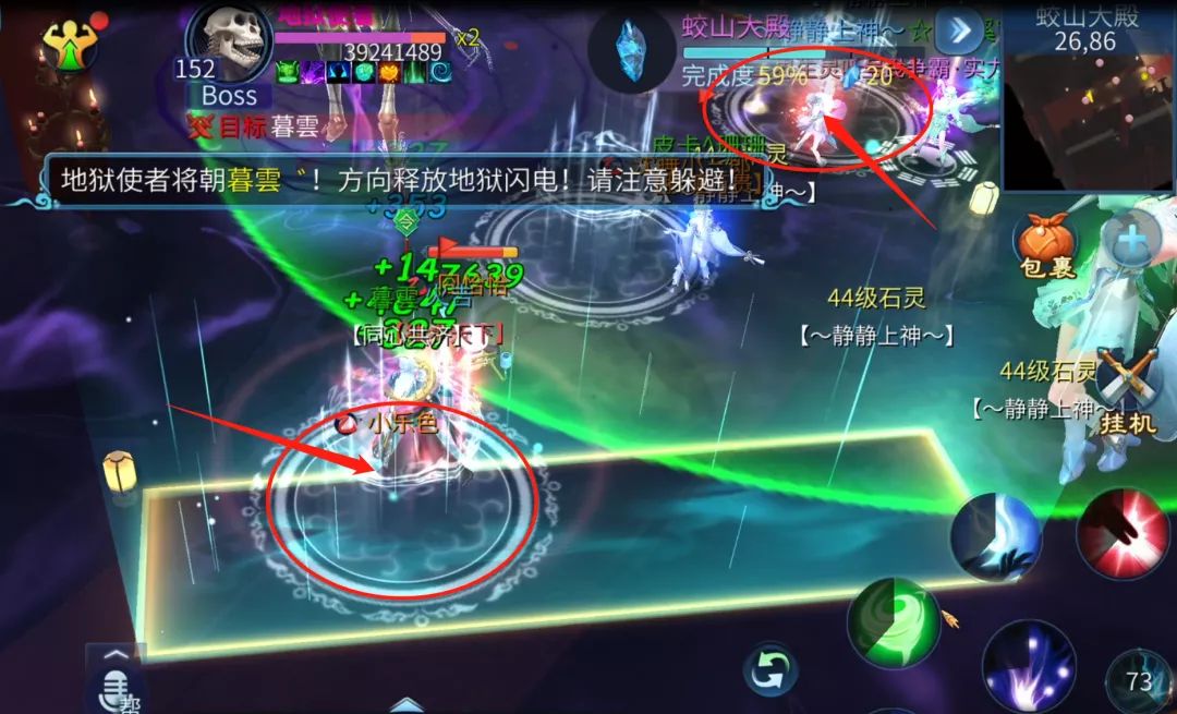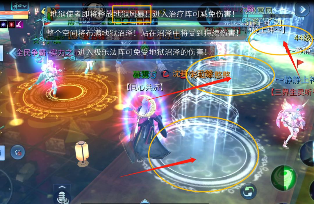 第二关的难点在于极乐使者的法阵会给地狱使者回血,所以尽量站在上下两个圈中来打伤害,防止配合失误。
