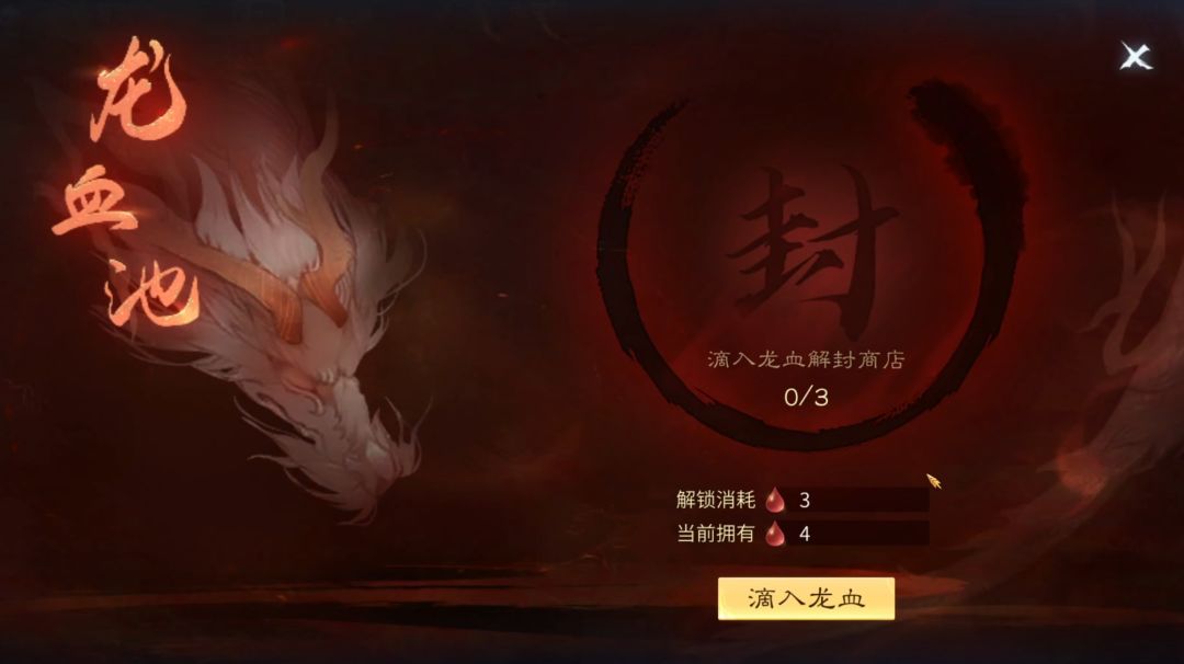 首次开启商店消耗3滴龙血解锁,解锁后永久开启。宝箱开启获得龙血滴。
