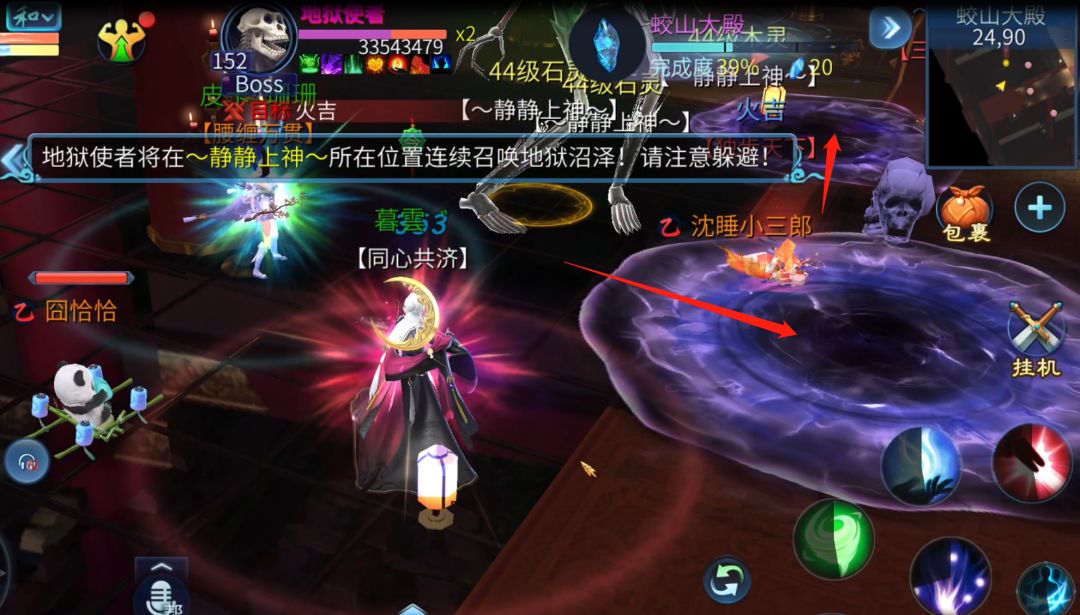 地狱沼泽:被点名玩家脚下出现多个紫黑色沼泽,被点名后离开人群。