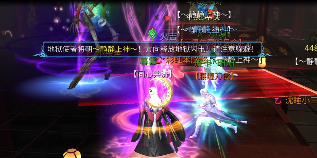 地狱闪电:朝被点名玩家释放红色弹道(被点名玩家可以朝人群反方向移动,其余玩家注意躲避弹道即可)