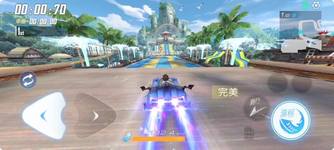 作为一款三星赛道,「水上乐园」的配置可谓是十分豪华,喷泉、水族馆、还有赛道两旁的椰林树影,以及造型别致的精美草屋,打造出完美的夏日狂欢体验。进入赛场迎面就是水上乐园的蓝黄相间的双色赛道,和一旁的滑梯撞色,令赛道看起来更加灵动活跃。
