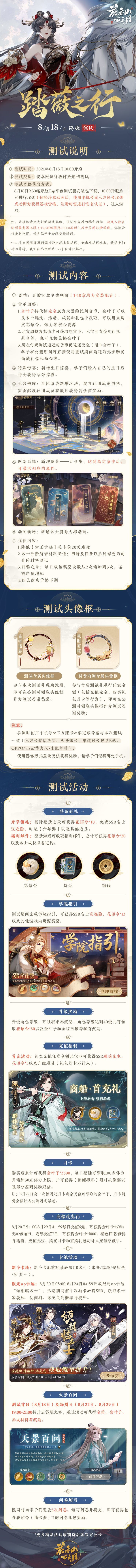 《花亦山心之月》“踏薇之行”测试将于8月18日正式开启,本次测试详情如下: