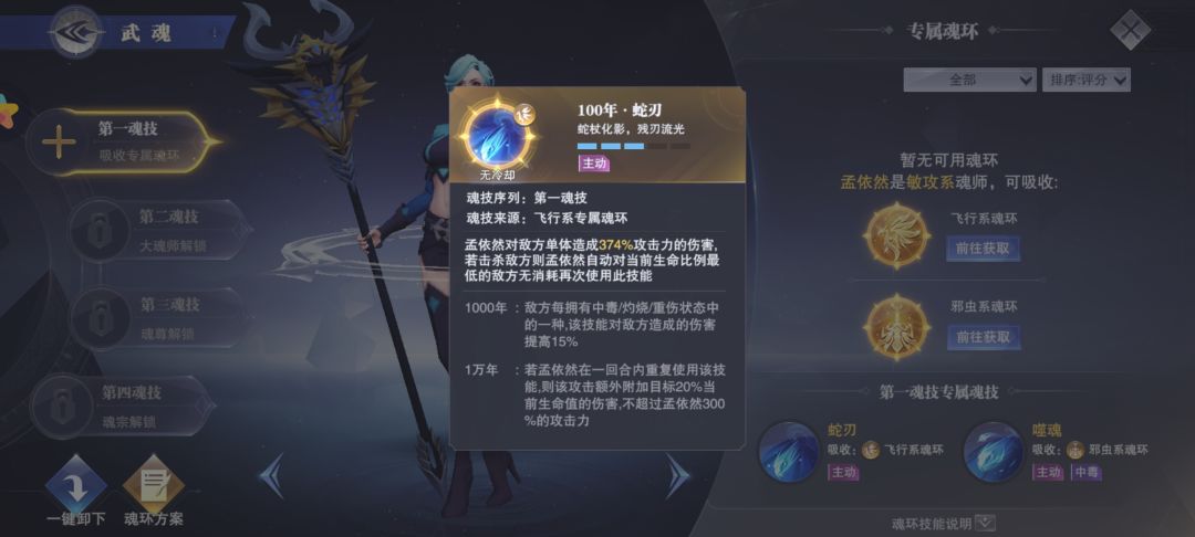 加点方面,孟依然主要吃的是攻击加成,我们可以发现每个技能的上限都取决于他的攻击力,所以我们全点攻击,魂环方面建议选择2221可以配合毒队迅速叠加毒