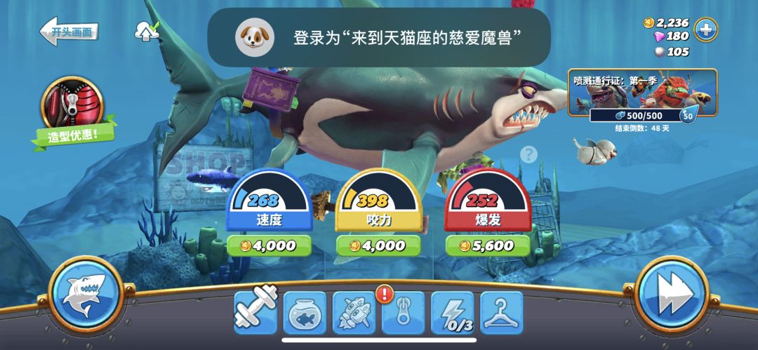 我感觉我跟其他友友玩的不是同款游戏,我肝了两天才买了这个大白鲨,升级都升不起,金币钻石少的可怜,我怎么看他们发的都几百万金币钻石
