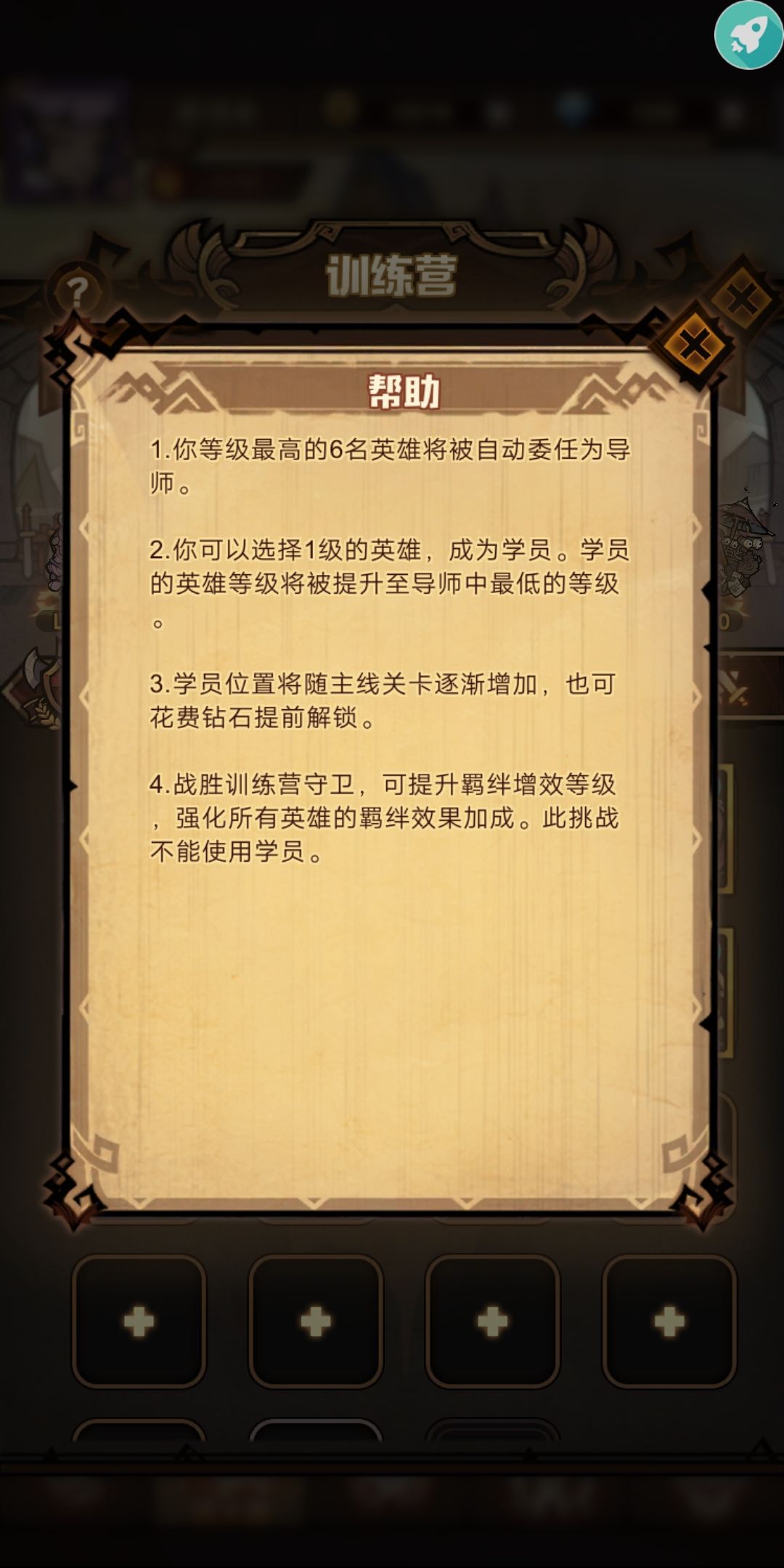 当我玩到今天时,沾沾自喜以为已经基本玩透了这个游戏,,,,在无事儿可干的情况下,就一直从最左边开始,一路挨个挨个点击所有图标,突然,在点击到训练营的那个问号内容时,我险入了沉思,请看图