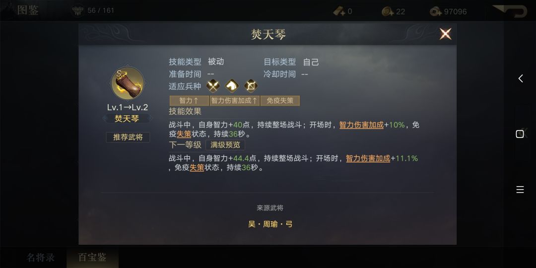 焚天琴获取难度有些大,需要拆周瑜才能拥有,这个技能增加自身智力,也相当于增加了大量的伤害,而且还有36秒的免疫失策,好家伙,36秒足够烧没敌方的兵了,而且周瑜还是赛季小卡包的主打,要拥有这样的免疫大爆发宝物,真的需要看脸。