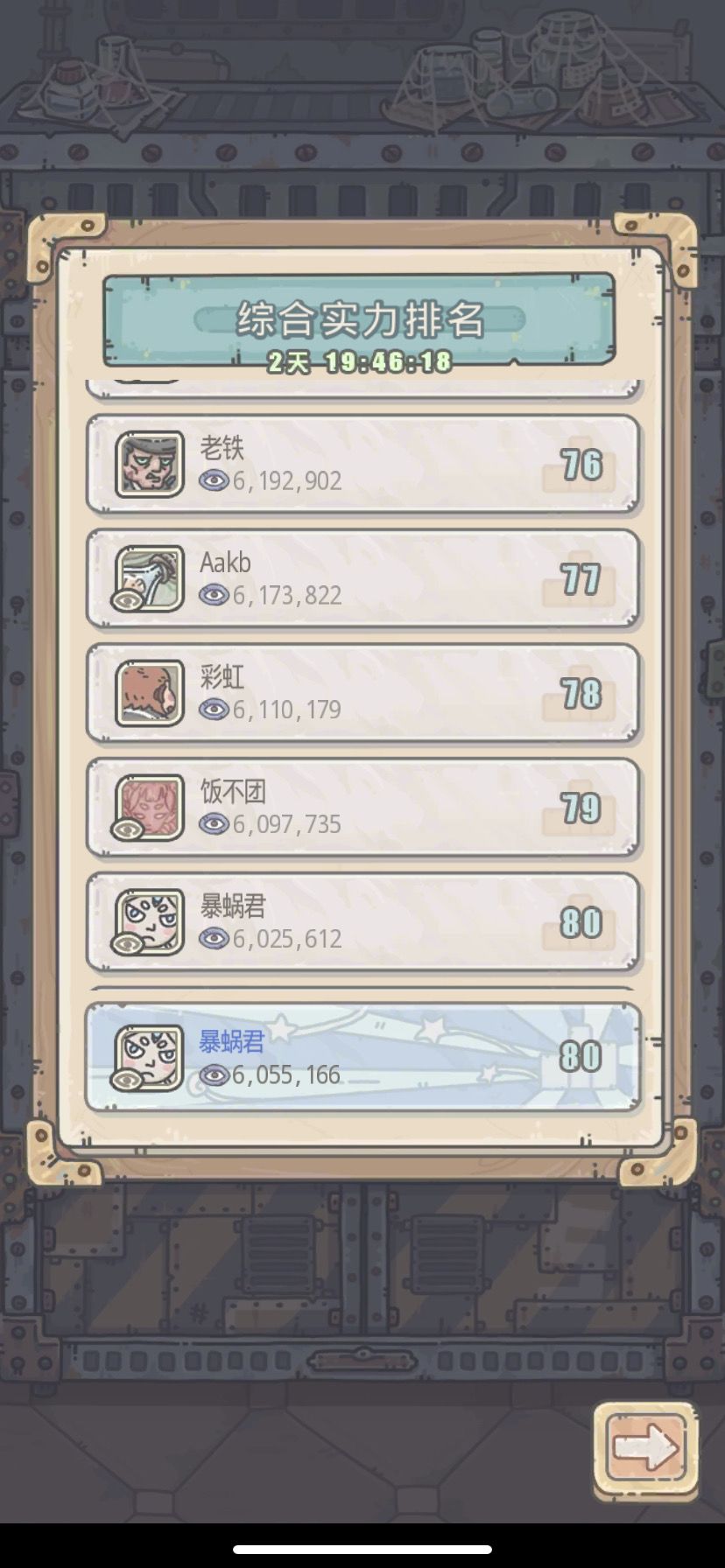 排行榜几个熟悉的名字消失了,估计是撤退了。不管他们怎么样,我觉得我玩的还是挺开心。终于在今天早上突破了600万大关,并且排名也达到了80名的新高度。另外,有关兵种的问题,虽然我的领导力还凑合140,在我们这个服也算中上,但是我的兵种战斗力低的很吓人才7.5万。看来又要研究一些帖子来丰富一下自己了,加油!加油💪!