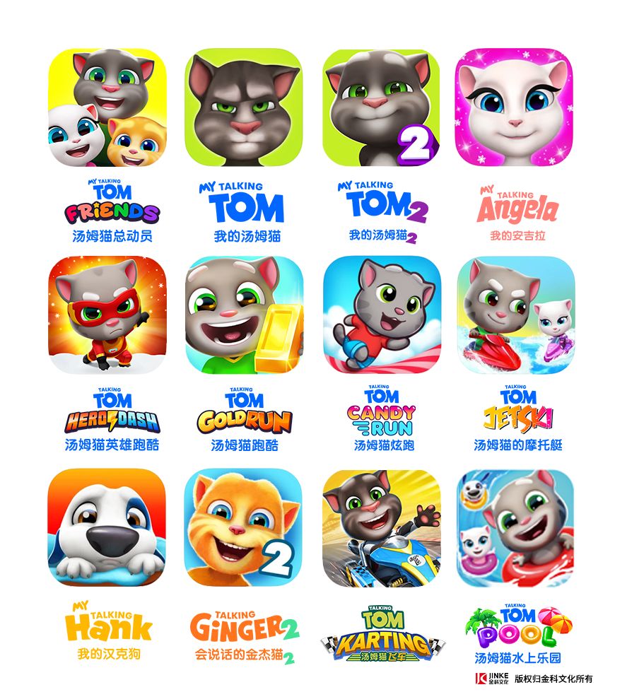 在《会说话的汤姆猫》一炮而红后,目前已成为金科文化全资子公司的Outfit 7,捕捉到了这一IP潜藏着的长尾机遇,于是趁热打铁,在接下来的几年里聚焦多元化的特色动物形象,相继推出了多款IP衍生新作。