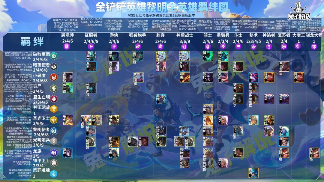 当你找不到自己想要的棋子的时候可以看这一张图,也帮助大家快速的认识头像与棋子的名字,你也可以尝试通过羁绊的组合设计出自己喜欢的阵容,阵容的强大主要是基于羁绊和棋子的数据来进行设计,更好的了解各个羁绊的具体属性也会让你对这款游戏有着更深的理解。