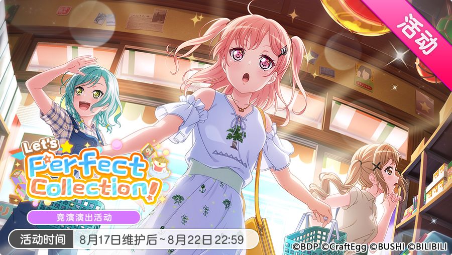 8月17日维护后,游戏内将开启「Let’s Perfect Collection!」竞演演出活动和「出门玩耍!Toy World Tour招募」,更新「★★★以上确定招募」,并追加翻唱歌曲《秒針を噛む》!