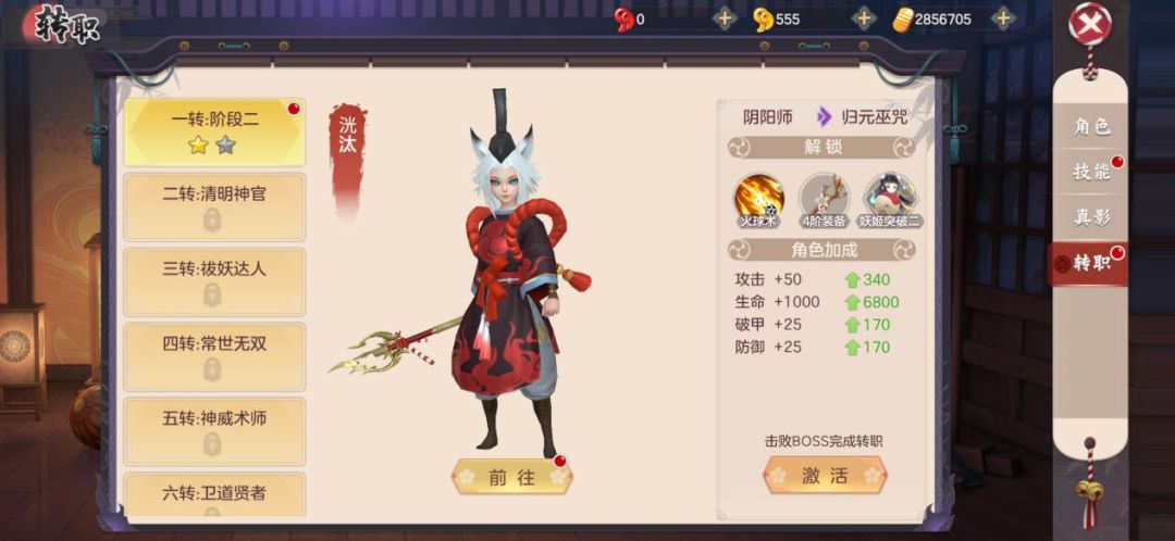 第三步:完成一转【阶段一】所需的4个任务后,点击转职界面的激活,击败一转【阶段二】的Boss“洸汰”后,即可完成转职。