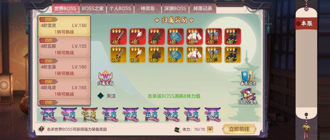所以想要提高装备的评分就要获得更高星级的装备,150级之前获取高级装备的主要途径是通过挑战世界Boss。