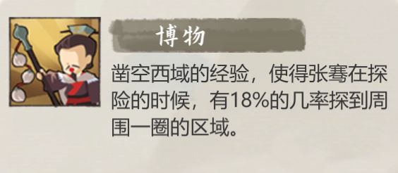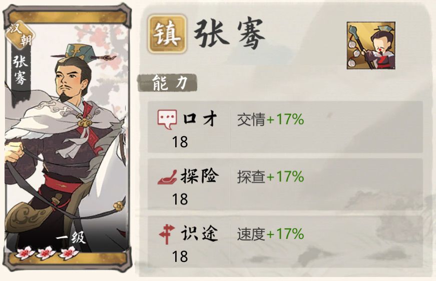 最后,门客会根据其生平的事迹,在游戏里赋予对应的能力,有的是擅长生产与经营,有的是善于探索与贸易,下面我们就以丝路最初的开拓者——张骞为例,来介绍一下。