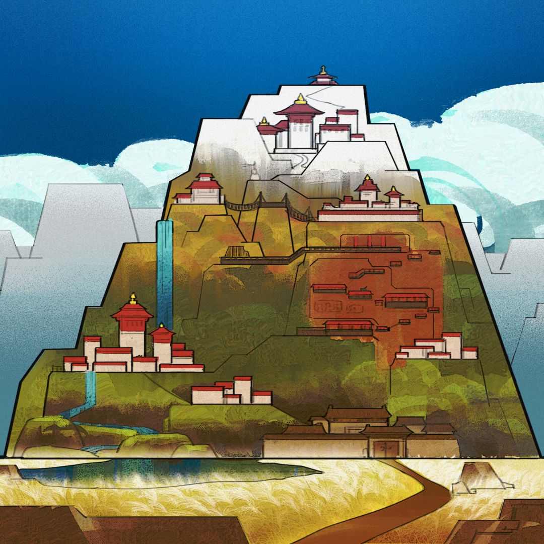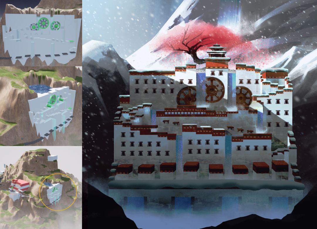 最近,工作室扑在了第五章节的设计制作上。在第四章日月山的思乡、迷惘之后,从第五章开始,公主坚毅地踏上了前往青藏高原的路途,越来越多的雪山场景,还有越来越多的藏式建筑和传统的民族文化元素都将相继出现在此章节中。