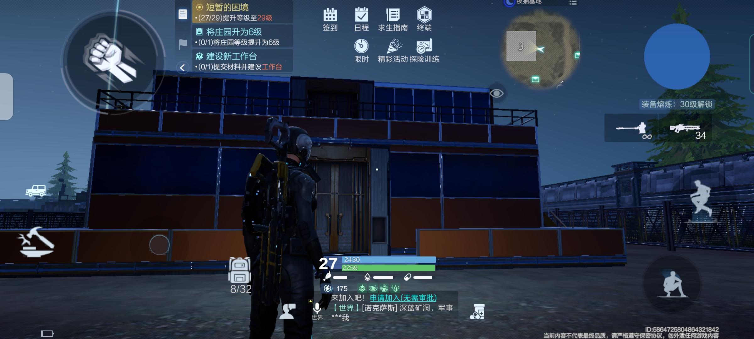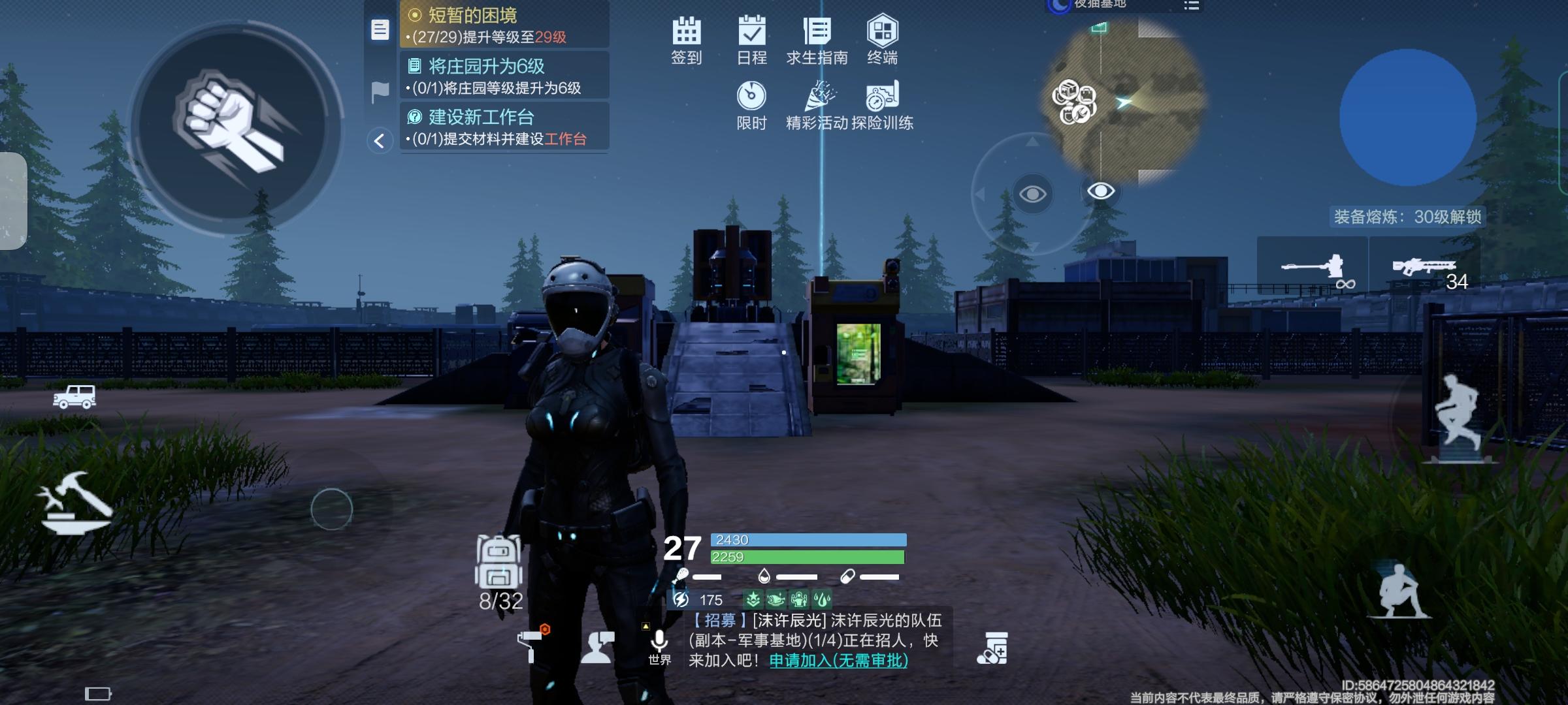 代号:降临是一款由MMC Society研发的一款科技末世求生手游,从我五天测评来看,这款游戏的可玩性很高,地图很大,可以做出来的东西也很多,在画面上来看,画面渲染精美,科技感很强,打击手感也不错,这款游戏我个人认为,如果是零充党,也可以玩的很好很不错,因为在这里面,所有的材料都可以从你完成任务,采集来完成,包括配件升级的材料,芯片升级的材料,装备改造的材料,源码的升级材料,里面可选择性也是很强的,拥有不同种类的配件,拥有不同的源码效果和改装效果,不同的芯片效果,在此基础上,可以搭配出多项的战术准备和战斗功能,例如近战,远点狙击,全能型战士,突击战士等等,各类搭配,多种武器,到现在为止,并不需要去抽取配方,升级庄园等级便会解锁,游戏内的传送阵功能,汽车功能,收复被荒潮占领的失地,摸索图内宝箱,副本,联盟空投等等一系列的多样玩法,并不会让游戏变得枯燥变得无味,反倒是随着等级的解锁,玩法变得越来越多样,每天都会有更多的新鲜感,在这里不用担心升级很慢,基本上一天把任务完成就能升个几级。在游戏刚开始的时候的机甲以及异形入侵的剧情确实有吸引到我,同时在整个剧情当中,主人公和几个伙伴的精神始终贯穿着游戏本身。探索,创新,合作,永不言弃,坚持不懈,是我这一段时间对于这个游戏本身的理解。