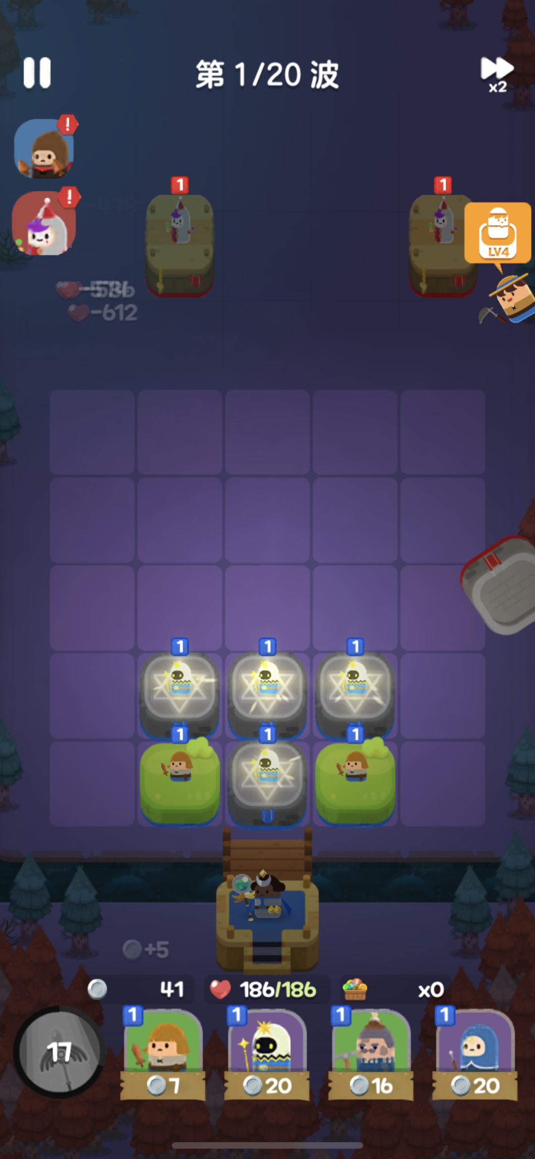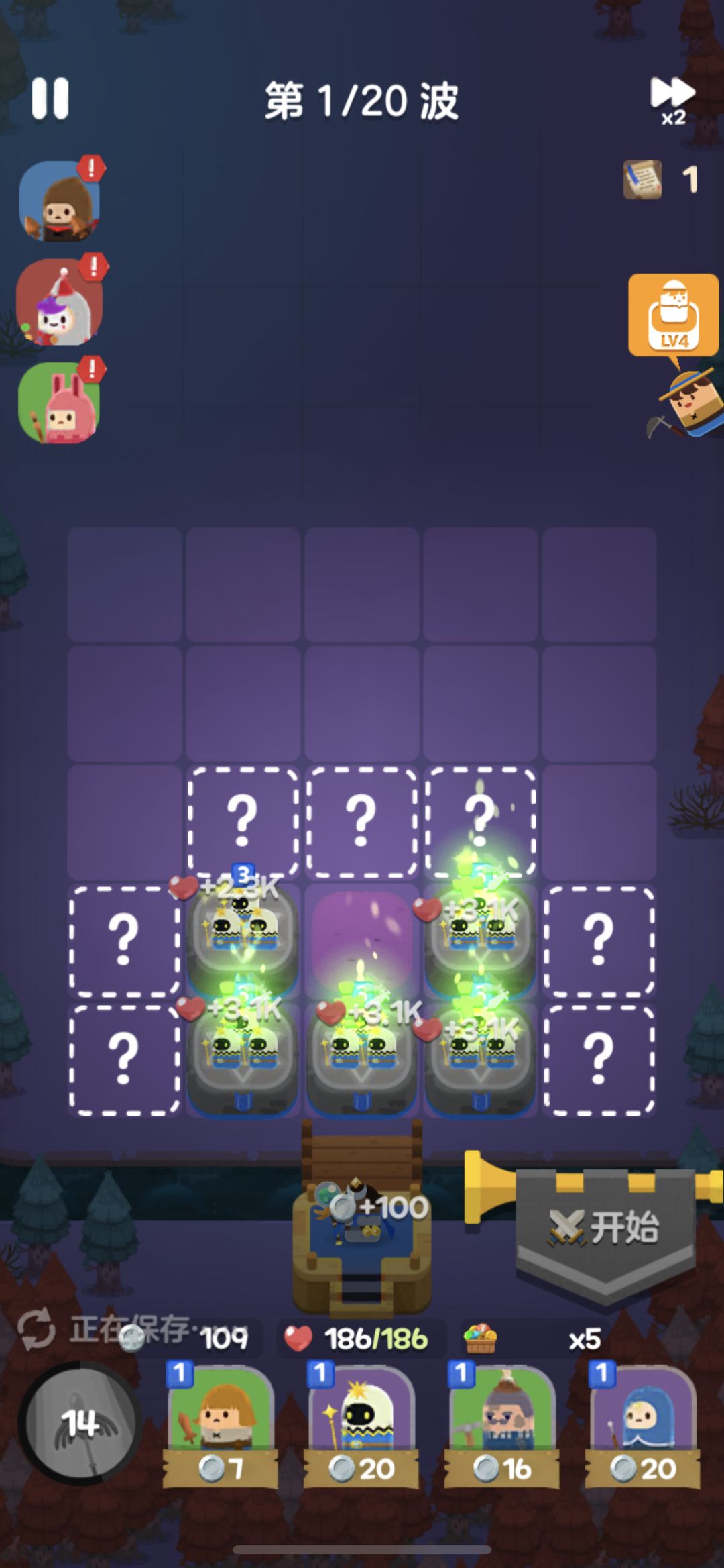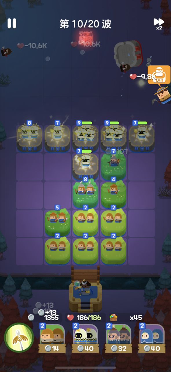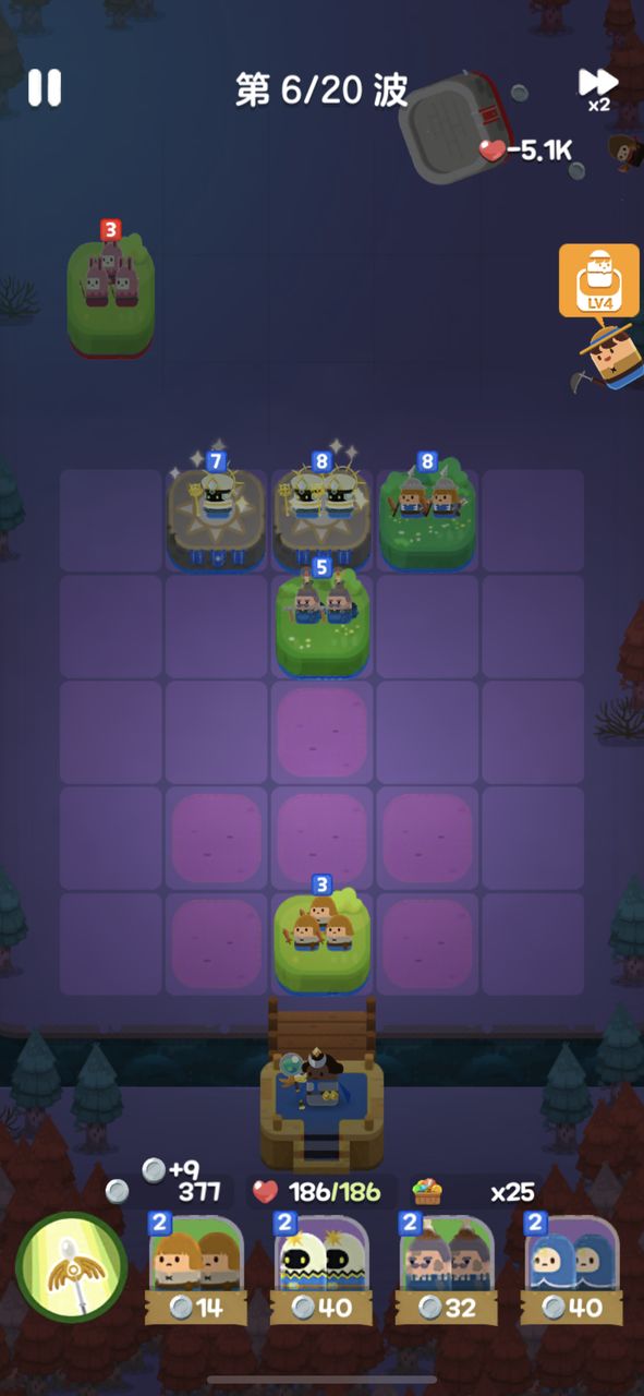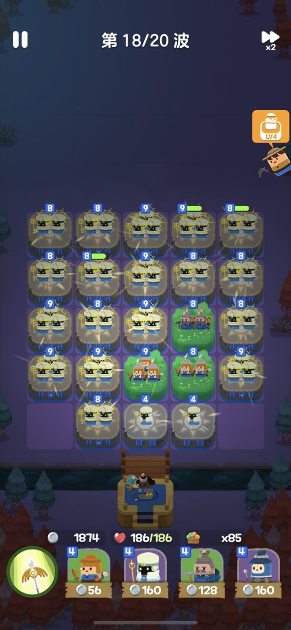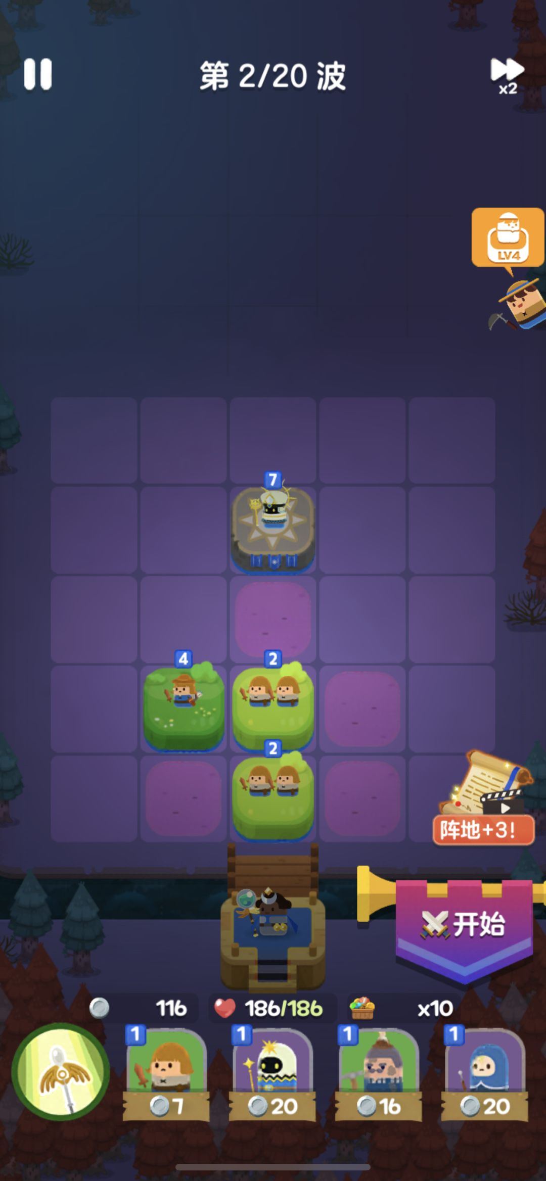开局用4个1级光波法师+2个1级侍从,如果感觉压力特别大,可以开局看广告选择一个农民。