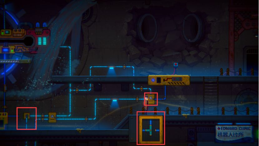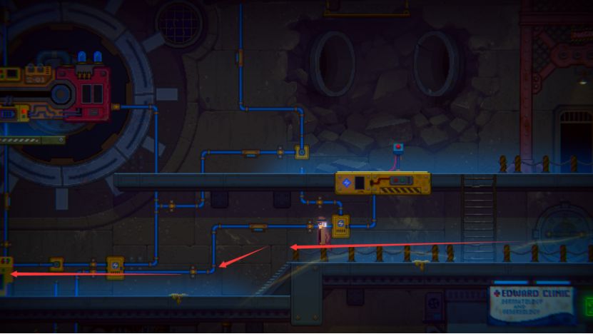 我们沿下图箭头一路向下,沿着凝结液的痕迹到最左边,发现有墙里有一个暗门,需要把电力引到这里才能打开。