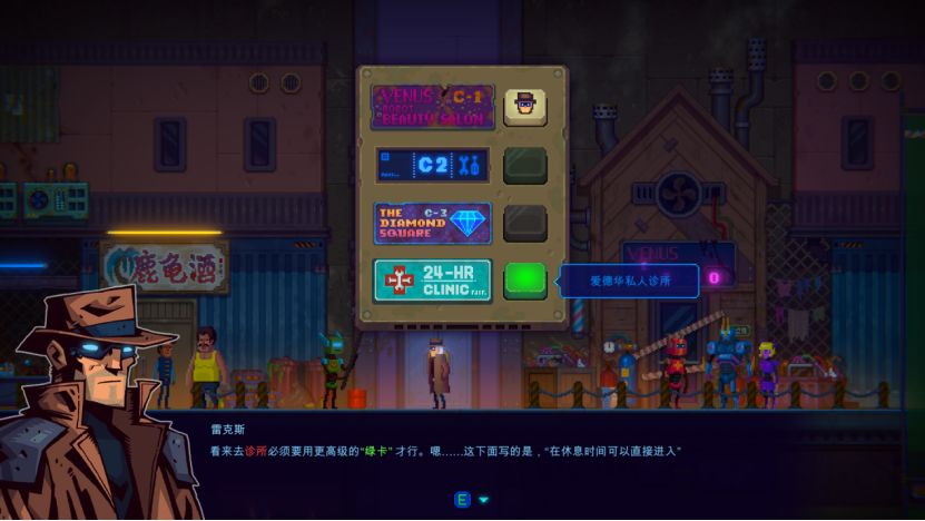 我们打算乘电梯去诊所,但是发现需要绿卡或者整个地区变为休息状态,这个状态似乎和这里的大时钟有关,我们于是一路往左边去调查时钟。
