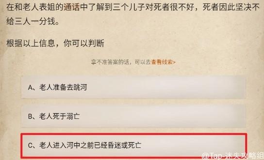 一位中年人找上们来,希望能拜托探案馆找到他失踪的父亲。根据这位中年人描述的情况来看,他怀疑保姆与他的父亲失踪有关。最后,失踪的老人终于找到了,不过已成一具尸体,而在征询的过程中,来自探案馆的你还了解到老头子除了这位中年怀还有二个孩子,且关系都不和,凶手到底会是谁?