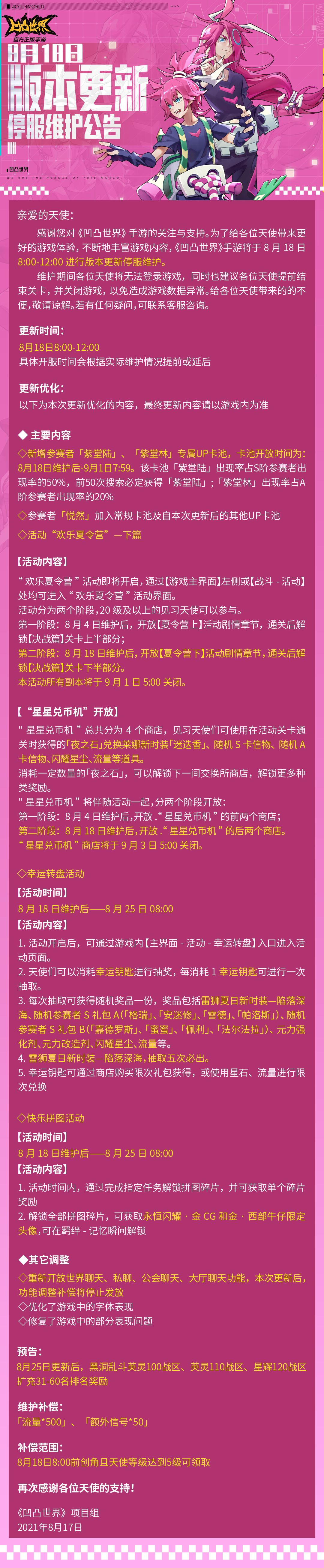 感谢您对《凹凸世界》手游的关注与支持。为了给各位天使带来更好的游戏体验,不断地丰富游戏内容,《凹凸世界》手游将于8月18日8:00-12:00进行版本更新停服维护。