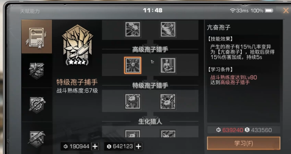 【迅捷孢子】与【灵动迅速】可以增加移速,对于打本来说意义不大,但是在PVP时会有一定效果。同理,击不倒boss但是可以击倒玩家的【狂化孢子】以及降低敌人移速的【致残爪击】也是针对PVP时使用的。因此,以上四点打副本玩家可以选择不点。【虚弱孢子】是减弱敌人实力的,必须点满。【活性强化】、【亢奋孢子】、【亢奋时间】可以增加孢子猎手的血量护盾回复率以及伤害,是必点满技能。而其余的技能虽然也可以提高孢子猎手生存率,但是效果却普普通通,因此如果技能点较少的情况下,可以选择都不点。