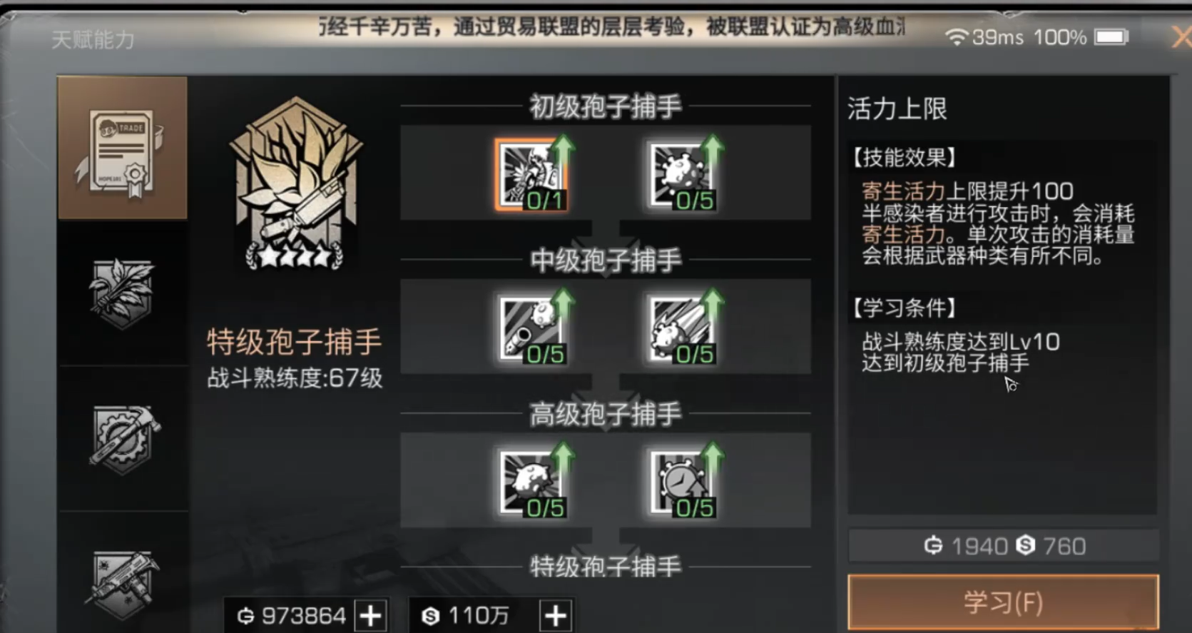 因此,接下来我们就来研究一下孢子猎手的技能。首先,【活力上限】可以提供孢子猎手的寄生活力,从而增强攻击时的续航性,减少变成感染者的风险,是必点技能。【强效寄生】则可以提升掉落孢子概率,也是需要点满的技能。【孢子射击】可以让玩家捡起孢子后的第一发子弹和二十整数倍发的子弹变成范围伤害的孢子弹。换句话来说,就是拿着步枪但是能够实现喷火器的效果,因此这个技能也是必点满的。从而,可以提升该技能威力的【活力子弹】也要点满。而作为延长孢子状态的【时效强化】以及减少子弹间隔(二十整数倍变成十八整数倍)的【子弹强化】,相对比就比较鸡肋了,可以选择不点。