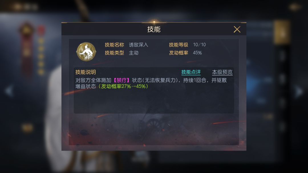孙膑的自带技能效果非常简单强硬,释放后直接对敌方全体施加禁疗与驱散,除了少数菜刀队不吃这两个效果,绝大多数的阵容核心点都会被该技能克制一二。虽然禁疗效果的持续回合较短,但无需准备回合,没有前置条件,并且目标为敌方全体,整体收益仍旧非常可观。