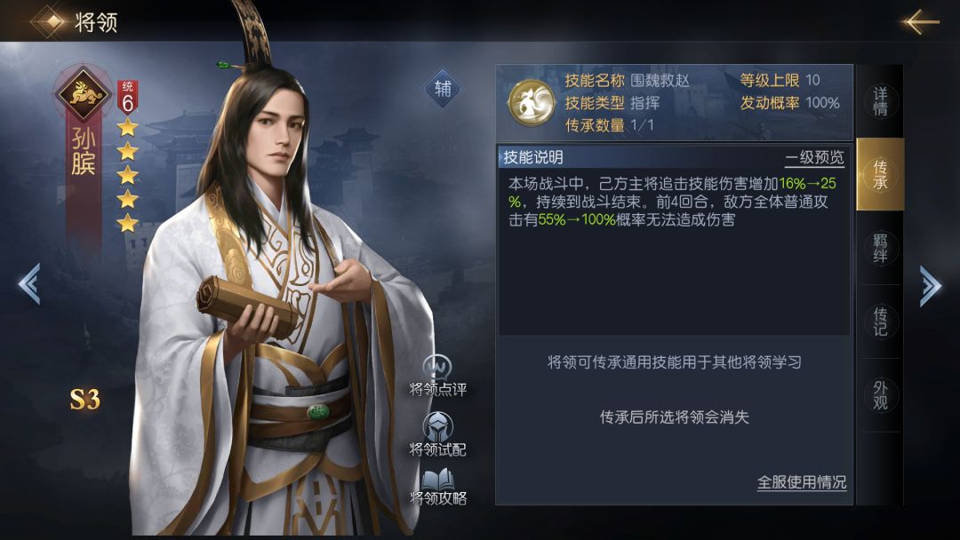孙膑的传承技能虽然与他自身无配合,但两个功效可拆分来看。第一个效果是主将全程追击技能加成,可用于菜刀队作为增伤类技能,第二个效果为前4回合敌方全体普攻必定无法造成伤害。该效果虽然不能阻止普攻的执行和追击的触发,但能直接隔绝群攻的触发伤害,即使是断生这类必定发动的群攻技能,也会因为0普攻而失效,堪称菜刀队终结技,非菜刀的物理系队伍,也会因为4回合的普攻空缺损失许多伤害。所以即使队伍中用不上追击增伤,也能将该技能当作一个强有力的克制技能。