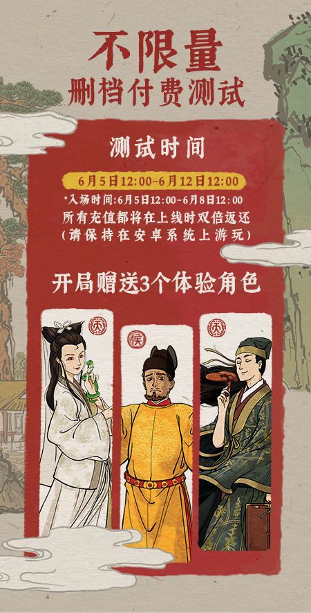 测试类型:不限量+限时+含内购(上线后双倍返还)+删档
