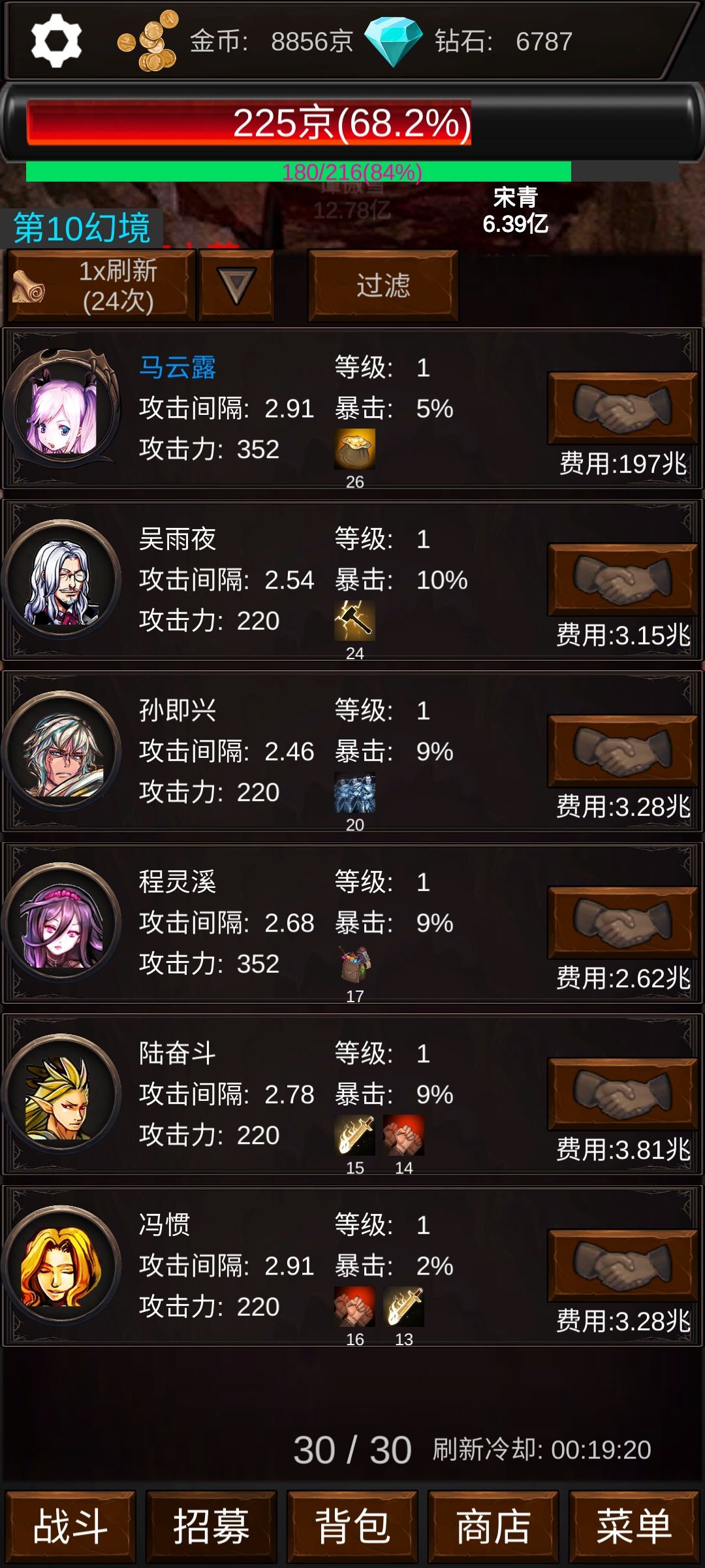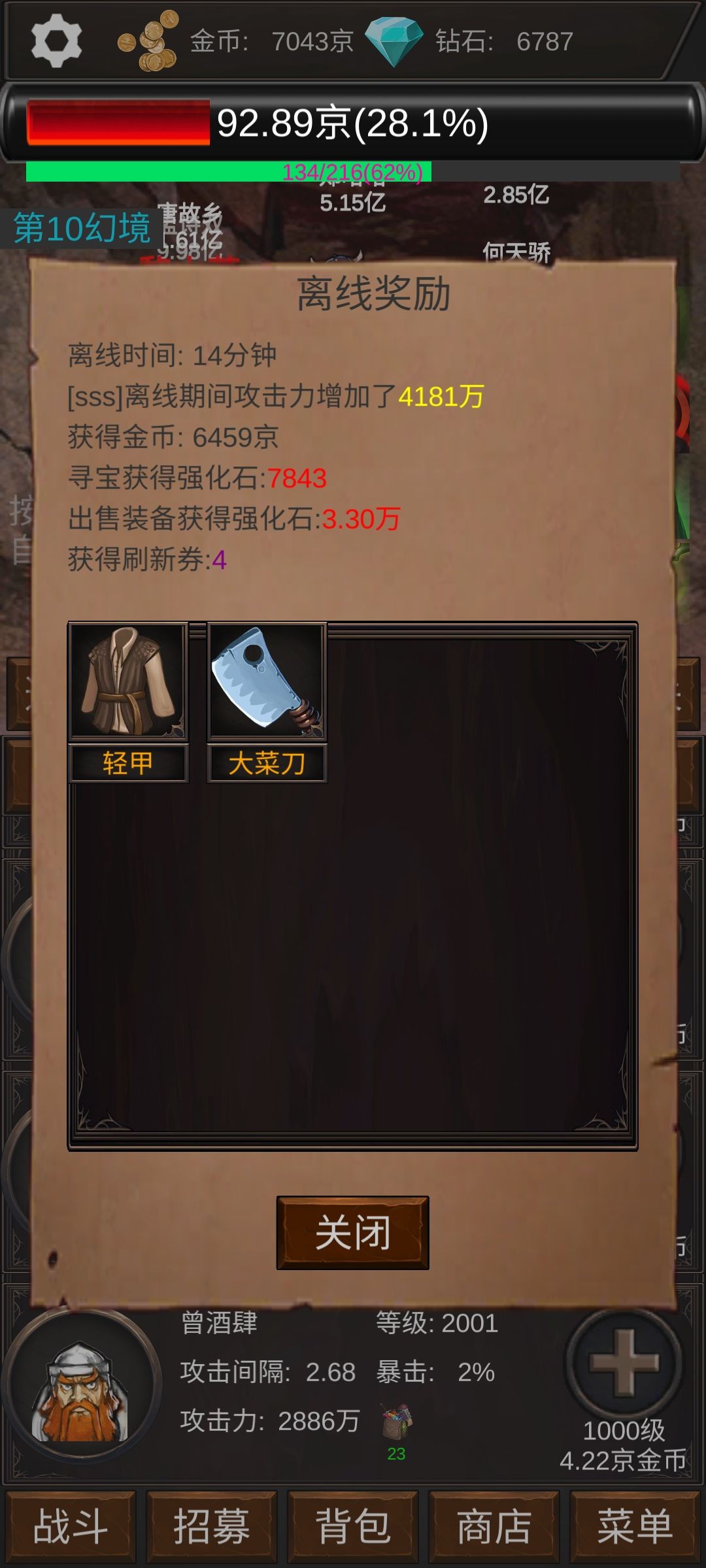 所以建议初期用不着大力挖矿,随缘好了,有品质高一些的挖矿佣兵可以留三两个!!多了毕竟影响爬塔????到幻10 这才是游戏刚刚开始的门槛吧???至于幻10前怎么玩?其实幻10之前都是过渡期,这个时间很短,咋们辛辛苦苦刷一批矿工,到了白天还要换下来爬塔,不如把寻宝拉满?一个刷新卷500$,用我的经验来说,我一天寻宝不低于150卷轴,强化石100w⁺,