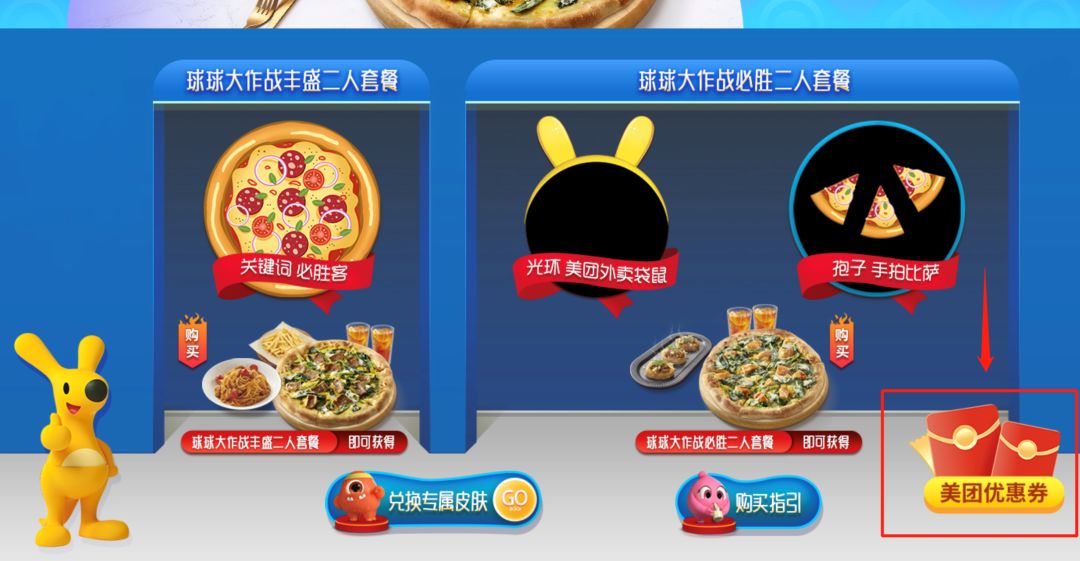 必胜客×《球球大作战》系列套餐:球球大作战必胜二人套餐-59元(套餐内含:奶油菠菜鸡肉比萨[手拍][普装]1份,炙烤肥牛Tapas 1份,柠檬红茶(冰)2杯)。购买即可获得游戏道具兑换码:“光环”-【美团外卖袋鼠】(永久)x 1,“孢子”-【手拍比萨】(永久)x 1。