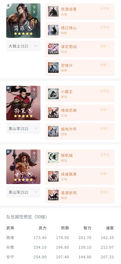 该阵容的思路来源于常规的核弹孙策,保留了原本的谋定、玄谋、敛威+空城/画地等基础框架,但对主将和副将的人选、技能进行了调整。(孙策政治高于简雍,使用画地为牢更稳定)