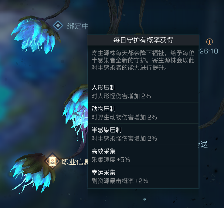 职业信息掌握我们各项职业升级认证重置等等。半感染者会多一个孢子猎人的职业,不过是一个主辅助型的职业。